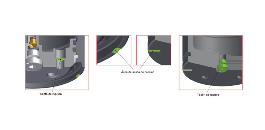 Este sistema es una protección contra la sobre presión del cilindro que se causa cuando entra aceite en el cilindro y se reduce la superficie interna, aumentando la presión. Se combinan una zona de rotura calibrada o bien un tapón de rotura posicionados en la base del cilindro y llevan un fresado de descarga en la base para que el gas pueda liberarse de manera controlada. En estos casos el cilindro se desecha.