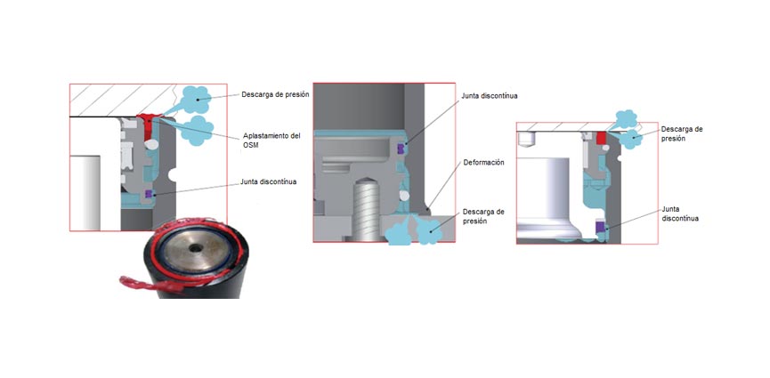 Este sistema ofrece una protección activa por superar la carrera nominal. Dependiendo del tipo de cilindro este sistema puede tener distintos formatos. El anillo de seguridad OMS es un retén rojo que se sitúa en unas ranuras entre el cuerpo y el casquillo interior, y desciende en caso de sobrecarrera, haciendo que el cilindro libere el gas. Esta acción “aplasta” el anillo sin deformaciones del cuerpo, pero permitiendo ver que ha sufrido una sobrecarrera. En otros casos se combina una zona deformable del cuerpo con unas ranuras discontinuas, que hacen que el cuerpo descienda en caso de sobrecarrera. En la última opción, hay unas ranuras entre el cuerpo y el vástago, que hacen que el vástago del cilindro se desplace hacia abajo haciendo que el gas se escape.