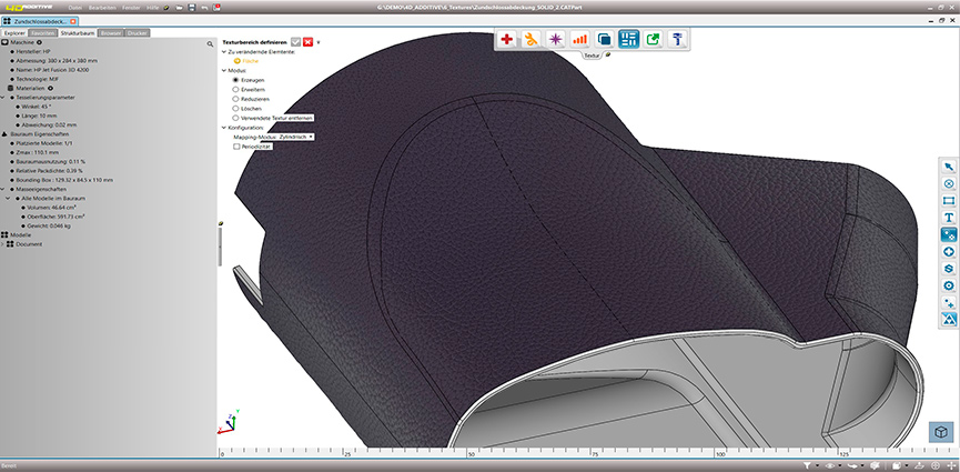 Las texturas de la herramienta optimizada 4D_Additive Software mejoran el aspecto, confieren a los componentes de fabricación aditiva un aspecto estético y disimulan las irregularidades que se producen durante la producción y la impresión, al igual que en el moldeo por inyección. Para el nuevo tipo de acabado superficial, ahora se dispone de texturas especiales basadas en la norma VDI 3400 en el módulo de texturas. Los acabados superficiales de la norma VDI 3400 de la Asociación de Ingenieros Alemanes (VDI) se utilizan en todo el mundo para productos en los que se desea una determinada textura o veteado por motivos estéticos y funcionales.