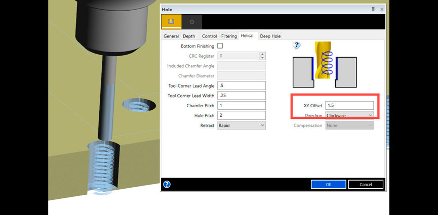 Se puede establecer un Offset XY al desplegar la estrategia “Helicoidal” del ciclo de Agujero, permitiendo a los usuarios controlar tanto el acabado superficial como el desgaste de la herramienta. “También lleva a reducir los tiempos de preparación de CAD a la vez que se garantiza que el ciclo es asociativo con el modelo sólido”.