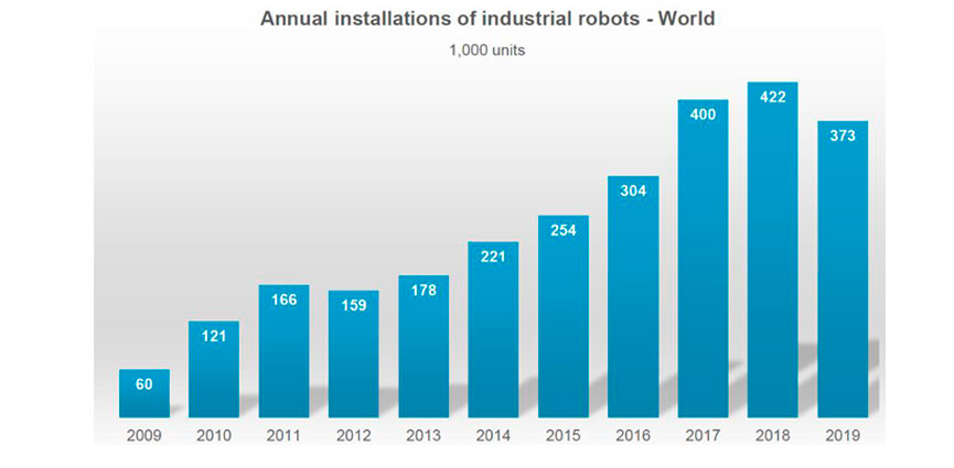 Tras 6 años consecutivos de crecimiento, 2019 presenció un descenso en instalaciones de robots a nivel mundial, con una cifra de 373.000 unidades vendidas, un -12% comparado con 2018. El descenso fue general por zona geográfica, liderando las caídas Asia y América con un -13%, mientras Europa contuvo el declive con un -5% respecto 2018. Por industrias, el sector eléctrico/electrónica cayó un 17% a nivel mundial, seguido de automoción, con un -16%.
