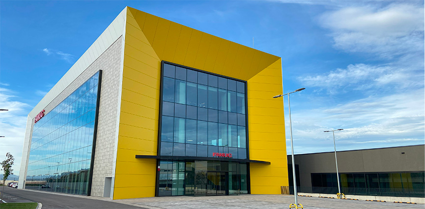 La nueva sede de FANUC Iberia consta de dos edificios unidos con una superficie total construida de casi 9000 m2 y alberga un gran almacén, zonas de pruebas técnicas, sala climatizada, zona de aplicaciones, showroom, oficinas, varias salas de reuniones y la zona de FANUC Academy: dentro de esta área, que es una de las más importantes de la nueva sede, hay varias salas de formación con todos los equipos necesarios para los cursos que se impartirán sobre CNC, robótica y máquinas.
