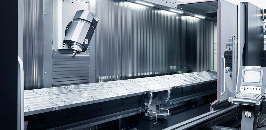 Centro de mecanizado en arquitectura de columna móvil para trabajos hasta en 5 ejes continuos mediante cabezal giratorio (+/- 105º) y divisor integrado de ø1000 mm, con unos recorridos lineales de X 4000 mm, Y 1000 mm y Z 1100 mm y equipado con un potente electrohusillo SK 50 de hasta 12000 rpm y 74 kW.