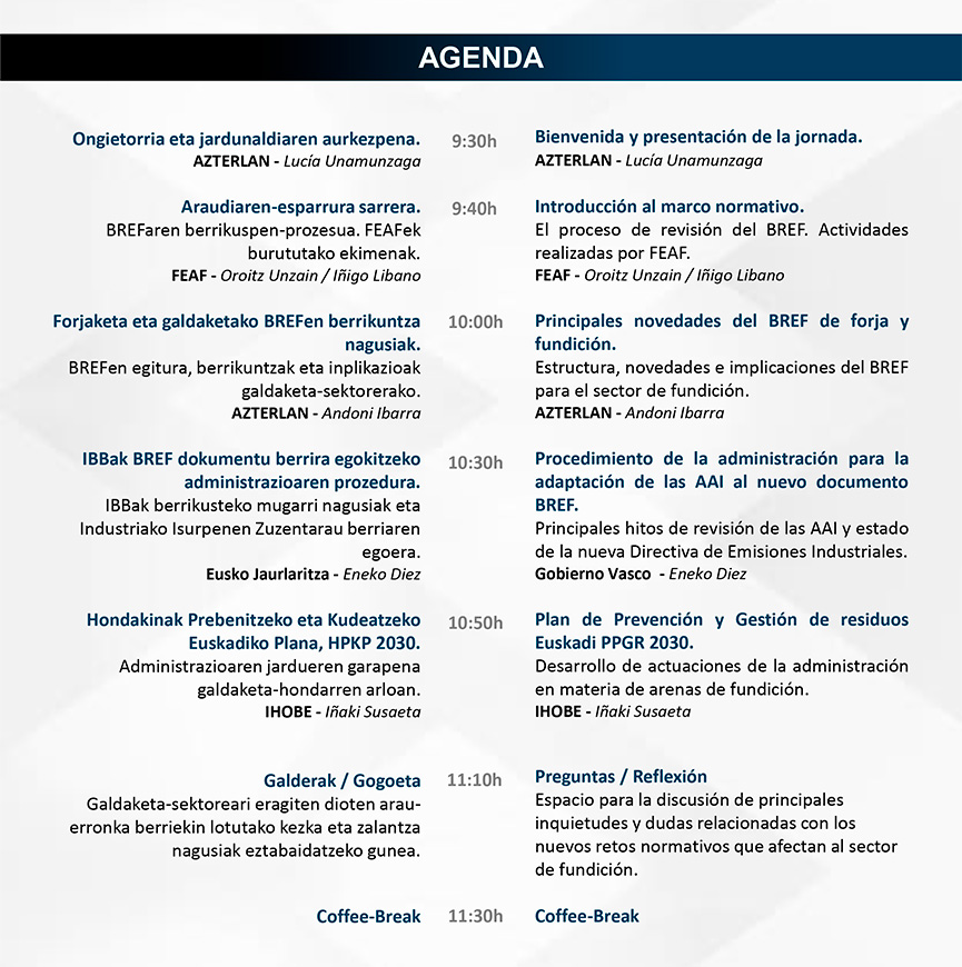 El encuentro, organizado por el Centro de Investigación Metalúrgica AZTERLAN, cuenta con expertos/as de la Federación Española de Asociaciones de Fundidores (FEAF), del Área de Prevención y Control Integrado de la Contaminación de la Dirección de Calidad Ambiental de Gobierno Vasco (IPPC-EJ/GV) y de IHOBE, Sociedad Pública de Gestión Ambiental del Gobierno Vasco.