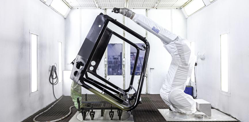 Actualmente, los pisanieves PistenBully de Kässbohrer se pintan con robots de Dürr. Esto reduce a la mitad el tiempo del proceso de pintado, porque la aplicación de pintura con robot es más rápida qué la aplicación manual. Para este fabricante internacional de vehículos especializados en la preparación de pistas, la automatización del proceso significa una mayor eficacia en la producción y una menor exposición de los trabajadores a las pinturas y disolventes.