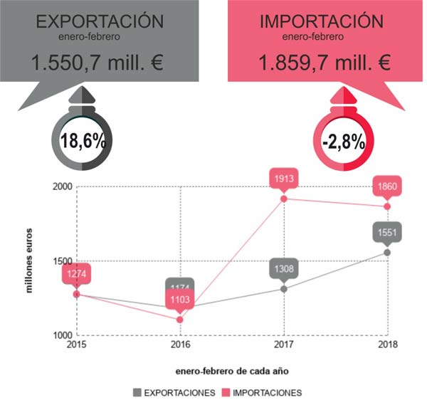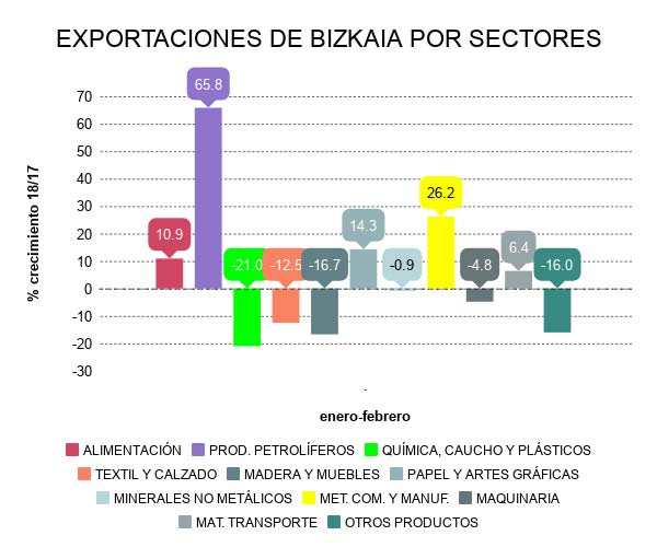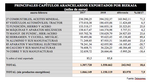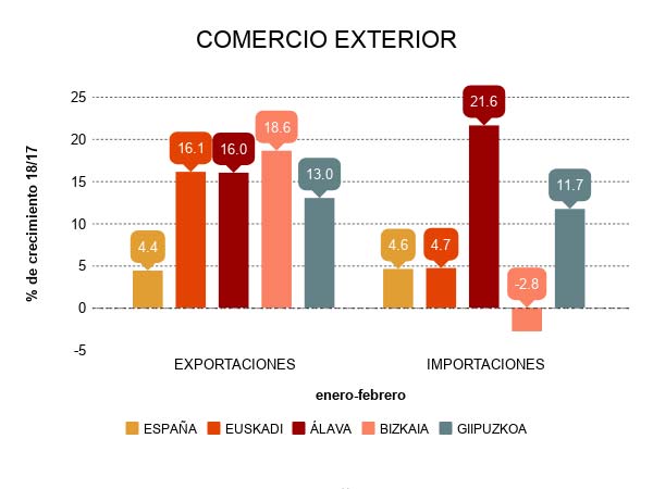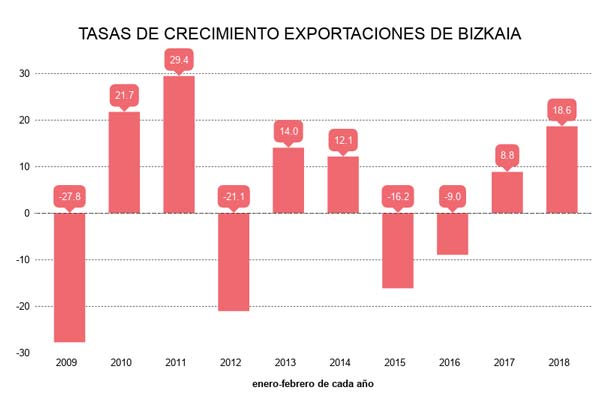 Los datos del comercio exterior de Bizkaia correspondientes a febrero vienen a confirmar el buen comportamiento de las ventas exteriores en lo que llevamos de 2018. De este modo, las exportaciones aumentan un 18,6% en tasa interanual, con una ganancia de 243 millones sobre la cifra del mismo periodo de 2017.