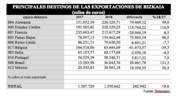 Alemania ocupa el primer lugar entre los mercados de destino de las exportaciones vizcaínas con una subida del 49% y concentra un 14,6% de las ventas exteriores. EEUU pasa al segundo lugar, duplicando sus cifras de 2017, mientras que las exportaciones a Francia disminuyen un 8,5%. Las ventas a los Países Bajos presentan también un incremento importante del 96,5%. El conjunto de las exportaciones a la UE-28 crecen un 9,4% en los primeros dos meses de 2018, suponiendo un 64,5% del total exportado por Bizkaia en este período.