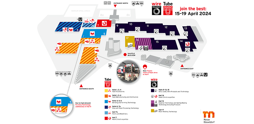 La tecnología de conformación se encontrará en los pabellones feriales 4, 5 y 6, y la tecnología de procesamiento de tubos en los pabellones 6 y 7a. Las máquinas e instalaciones se reunirán en el pabellón 7a. El pabellón 7, que alberga la Meet China`s expertise, está reservado de nuevo a la producción, mecanizado y procesamiento de tubos procedente de China.