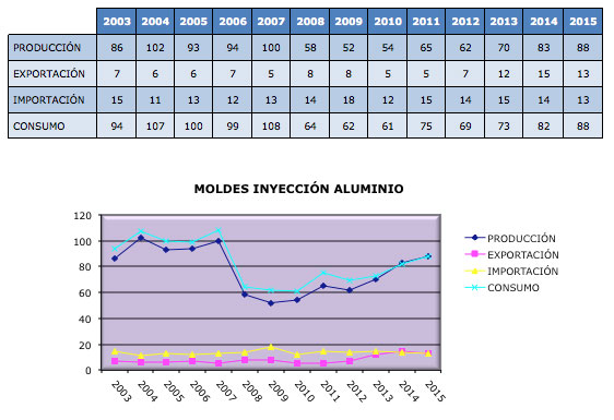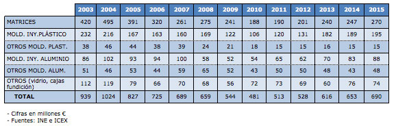 La producción española de moldes y matrices ha aumentado un 5,6% durante el 2015 respecto al 2014 y acumula un crecimiento sostenido del 43% desde su mínimo histórico del 2010. Estando todavía lejos del máximo de 1,024 millones de 2004, la cifra de 690 millones se puede traducir en plena ocupación para la mayoría de empresas fabricantes de moldes y matrices españolas, ya que el diferencial hasta el máximo se correspondería con las empresas que cerraron durante el período de crisis.
