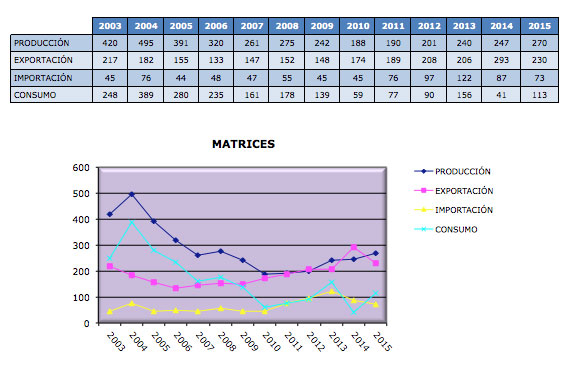 La producción de matrices está consolidando su crecimiento, un 44% en los últimos 5 años, y aunque no aumentan las exportaciones, éstas siguen una tendencia alcista, mientras que las importaciones se mantienen a niveles muy por debajo de las exportaciones.