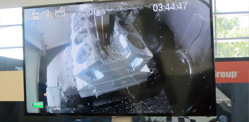 Para comenzar y después del desayuno de bienvenida, el acto se inició con una introducción de Carlos Arimón, director para España y Portugal de Hoffmann Group. Posteriormente pasamos a la demo en vivo en la sala de mecanizado, con demostración in situ y real de una pieza mecanizada en un bloque de aluminio, donde mecanizaron sin taladrina la réplica de un bloque motor V8, sencillamente espectacular, completado y visualizado con imagen en la pantalla grande del proceso. Todo el trabajo se realizó con la nueva generación Máster Alu GARANT, compuesta por varios modelos: Pickpocket, fresa tórica de MDI, fresa de acabado de MDI, Sloctmachine y fresa de manejo de MSI.