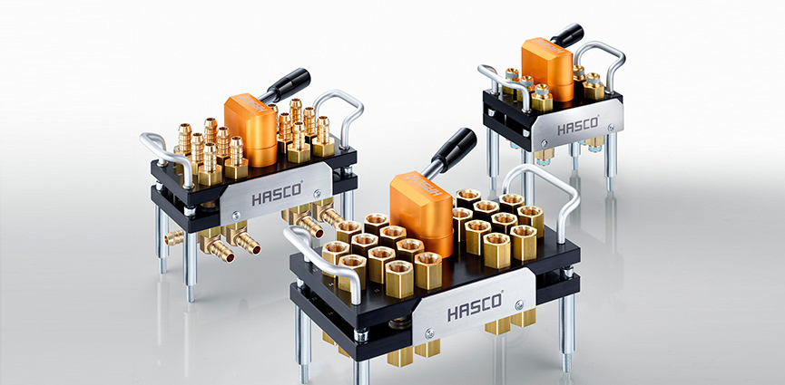 El innovador sistema multi acoplamiento HASCO permite la conexión centralizada de varios circuitos de refrigeración en un solo paso y ofrece numerosas ventajas en la optimización del proceso. Los procedimientos de montaje de las mangueras de la maquina al molde se pueden llevar a cabo a través de una conexión fiable, con un solo movimiento de palanca y sin ningún riesgo de mezclar los diferentes circuitos de refrigeración y mangueras.