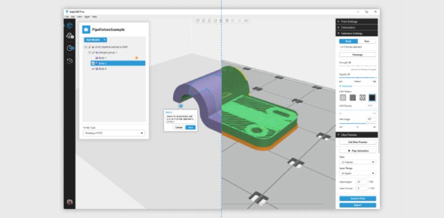 Mediante la asignación directa de atributos a los modelos CAD, el usuario puede detectar áreas de resistencia y rigidez, controlar los rellenos, garantizar la existencia de material suficiente alrededor de los orificios con inserciones y evitar las juntas. Como las rutas de herramienta se generan automáticamente a partir de las asignaciones de modelo, el usuario dedica mucho menos tiempo a la configuración de la pieza sin renunciar a la fabricación de piezas FDM resistentes, especializadas y de alta calidad.
